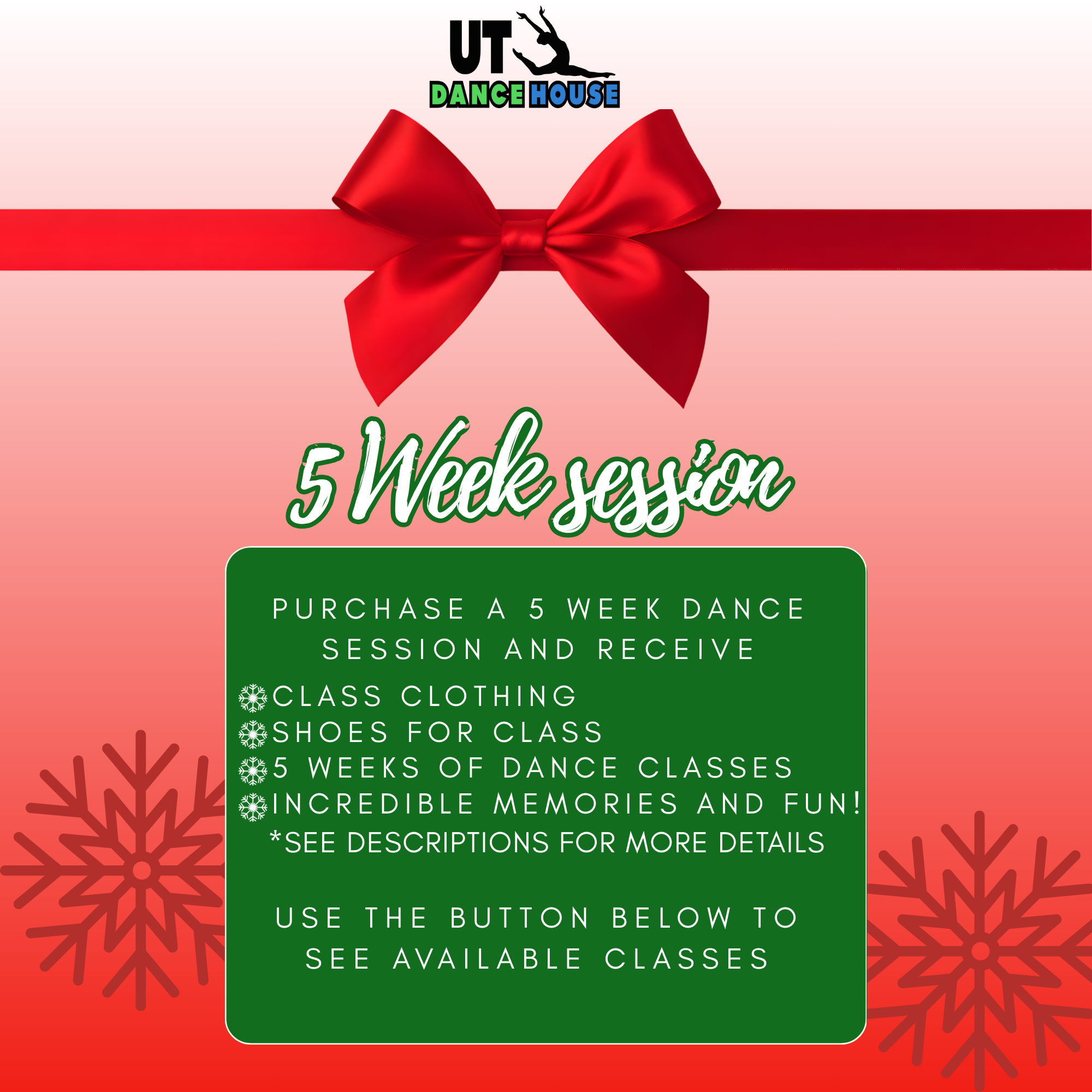 Purchase one of the 5 week dance sessions below. Starting Jan 5th through Feb 7th. All session prices include clothing and shoes for classes see individual class descriptions for details.